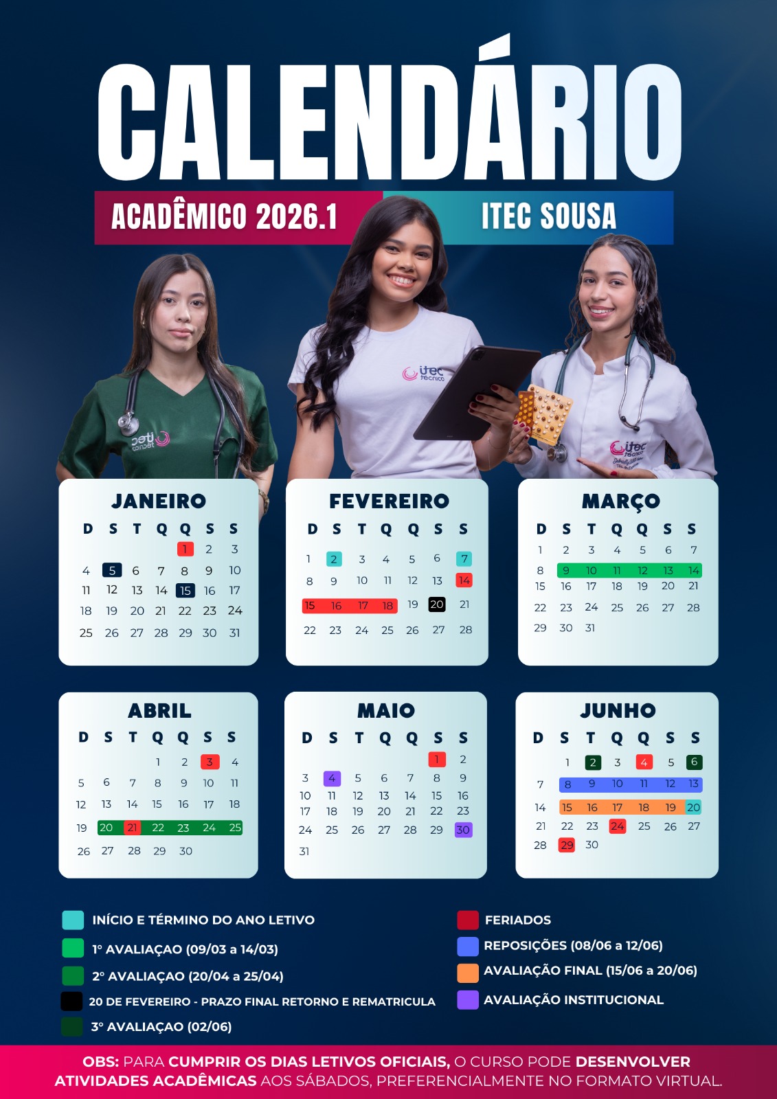 A ITEC divulgou o calendário acadêmico para o segundo semestre de 2026 do polo Sousa. O documento apresenta as principais datas, como início e término das aulas, feriados e períodos de avaliação. Também estão previstas semanas temáticas e eventos acadêmicos que enriquecem a experiência de formação dos alunos. O calendário serve como um guia para o planejamento das atividades ao longo do semestre, permitindo que os estudantes se organizem para cumprir suas obrigações acadêmicas e aproveitem as oportunidades oferecidas.